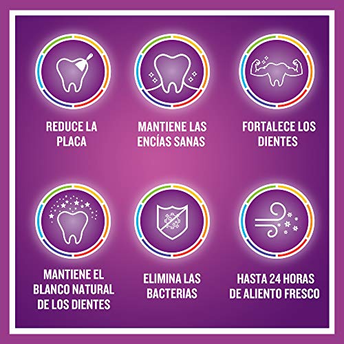 - Fórmula especial con 6 beneficios que favorece, entre otros, a la eliminación de gérmenes y a la prevención de caries y gingivitis; reduce en un 20% la formación del sarro en los dientes