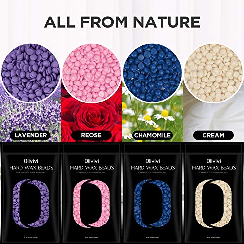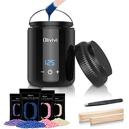 Olivivi calentador de cera depilatoria, recipiente de cera con revestimiento antiadherente, para la axila, depilación con cera con 4 perlas de cera de 100 g, espátula de madera, pinzas