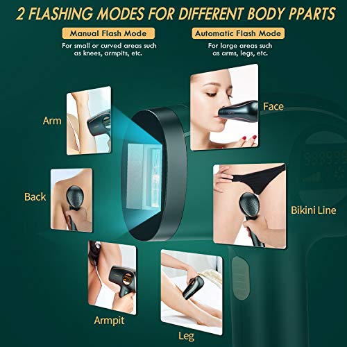 - 2 MODOS DE FLASH PARA TODO EL CUERPO -- Los modos de flash manual y automático están diseñados para satisfacer sus demandas en diferentes áreas de depilación. El modo de flash manual se usa principalmente para eliminar el vello en áreas pequeñas, como la línea del bikini, los dedos y los labios. El modo de flash automático se usa para áreas de depilación más grandes, como brazos, piernas, abdómen y espalda