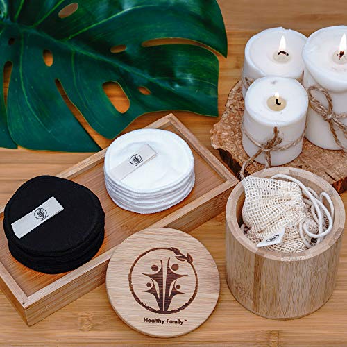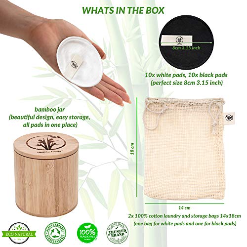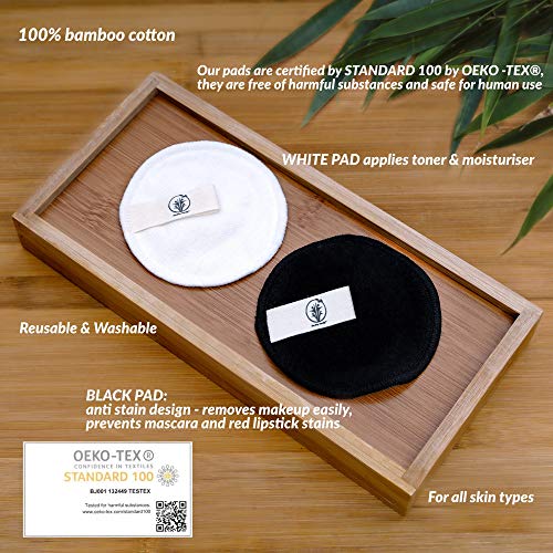 - ? JUEGO CON CAJA MUY ÚTIL DE ALMACENAMIENTO DE BAMBU, todas las almohadillas en un solo lugar, además de 2 bolsas 100% de algodón para ropa y almacenamiento con doble cordón- una bolsa para almohadillas blancas y una para almohadillas negras. Tamaño compacto para refrescarse y limpiarse vayas dónde vayas: viaje, gimnasio, escuela, playa.