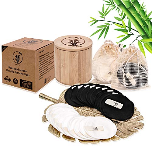 20 almohadillas desmaquillantes reutilizables de algodón de bambú. DISEÑO ANTI-MANCHAS. El juego incluye un tarro de bambú de almacenamiento, 2 bolsas de lavandería y de viaje. Diseño anti-manchas.