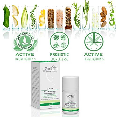 - ¡ES NATURAL SUDAR! Lavilin es un desodorante sin aluminio de larga duración para los atletas. Su sudor ayuda a regular la temperatura corporal y elimina los desechos de forma natural. Al neutralizar las bacterias causantes de olores, usted no se queda con ninguno de los olores desagradables asociados con la transpiración. Con este desodorante roll-on, no hay obstrucción de los poros ni irritación causada por los productos químicos fuertes que se encuentran en los anti-transpirantes.