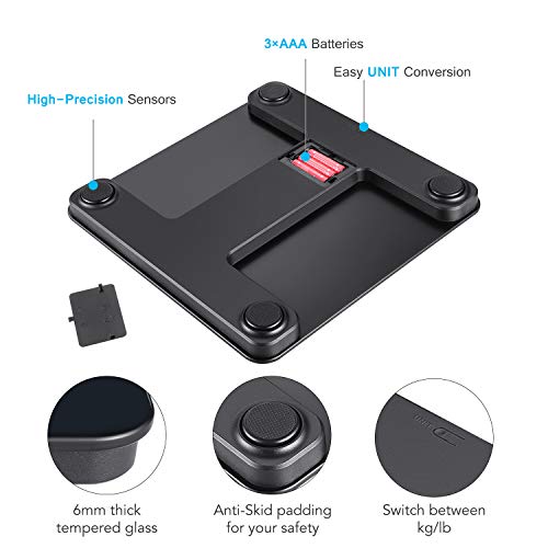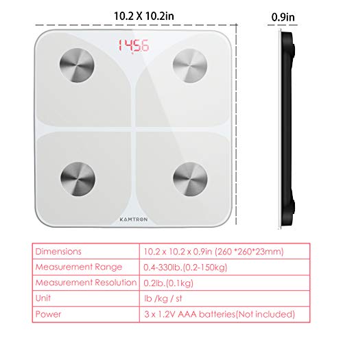 - ?? -[Alta precisión y alta calidad] Báscula de Baño con una placa de vidrio templado 6mm de alta calidad y 4 de placas de electrodos, el sensor de alta precisión de medición con incrementos de 0.2 lb/0.1 kg y tienen una capacidad de 330 lbs/150kg. 3 pilas de AAA. Con certificación de FDA, FCC, CE, ROHS