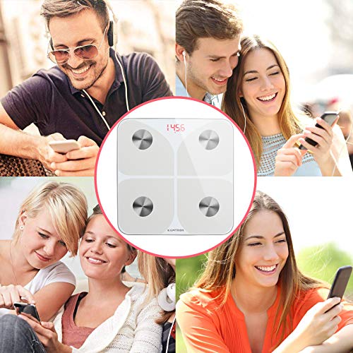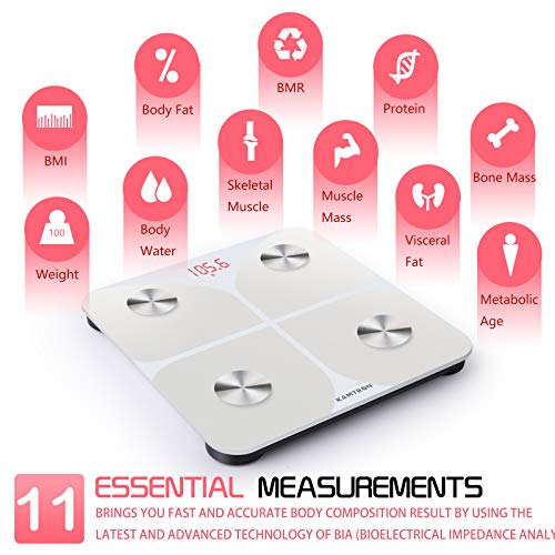 - 【13 funciones】 La escala inteligente de grasa corporal con análisis de impedancia bioeléctrica (BIA) permite mediciones corporales de alta precisión para peso corporal, grasa corporal, músculo, proteína, hueso, IMC, BMR, hidratación y masa corporal baja en grasa, AMR, grasa subcutánea, músculos esqueléticos, forma del cuerpo. También puede guardar las lecturas en la aplicación para que pueda seguir fácilmente la pérdida de peso y el progreso de la salud.