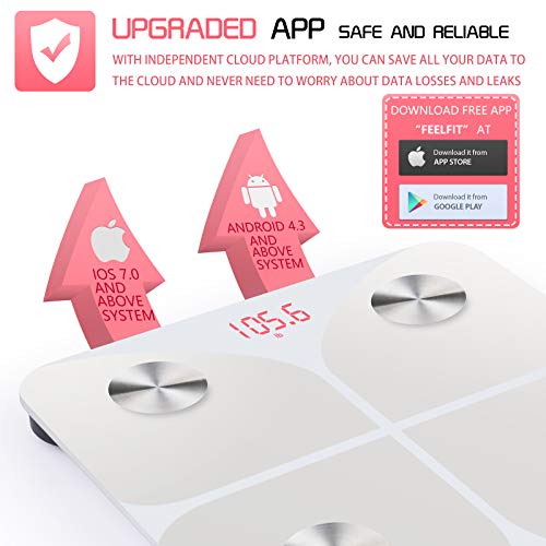 - ?? -[App mejorada y ilimitados usuarios] Basculas de baño grasa corporal tiene una plataforma de nube independiente , seguro y sin riesgo de pérdida de datos y fugas. Apoya un número ilimitado de usuarios,descarga gratis desde Apple App/App "Feelfit" en el Google Play, usted y su familia pueden compartir una báscula."Feelfit"APP está sincronizado con APPLE HEALTH,GOOGLE FIT y APP FITBIT