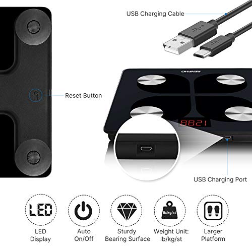 - Batería Interna Recargable y Para Toda la Familia - Función recargable USB con batería de litio incorporada. Si la báscula no puede encenderse con la batería completamente cargada, presione el botón de reinicio en la parte posterior del dispositivo. Al crear una cantidad ilimitada de cuentas para familiares y amigos, la aplicación puede almacenar datos ilimitados de diferentes usuarios