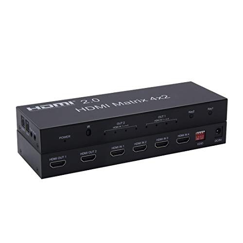 - 【4K Matrix 4x2 HDMI】 UHD 4K HDMI 4x2 Switch / Splitter con audio puede cambiar o dividir 4 fuentes HD en 2 pantallas HD, distribuir cualquier fuente a cualquier pantalla. También puede amplificar la salida de audio. La señal de audio se puede extraer y emitir mediante la salida de audio de SPDIF, Estéreo, Toslink o Auriculares de 3,5 mm.