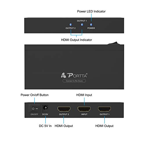 Portta HDMI Splitter 4K 2 Puertos 1 Entrada 2 Salida 1X2 V2.0 Switch HDMI Distribuidor Ultra HD Full 3D 4K@60HZ HDR HDCP2.2 Amplificador para BLU-Ray DVD/HDTV/PS3/PS4 Pro/Xbox 360/One/PC/macbook/Roku