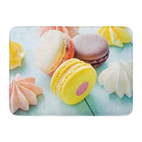 Kanaite Alfombrilla de baño Galleta Blanca Almendras y macarrones de Almendra de Colores sobre Dof Azul Poco Profundo Horneado Rosado Pastel Amarillo Decoración de baño Alfombra