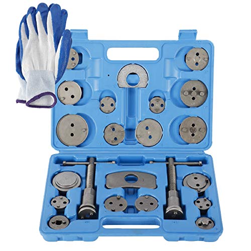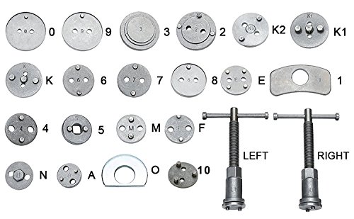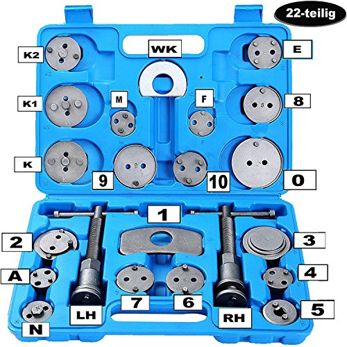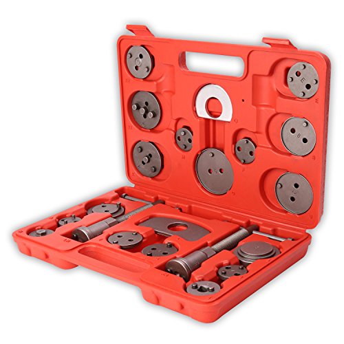 - El robusto juego de reposicionador de pistones se necesita para reposicionar el pistón de freno para poder cambiar los discos de freno, las zapatas de freno y las pastillas de freno. Este extenso juego de herramientas con 23 piezas se puede emplear para casi todos los vehículos más corrientes.