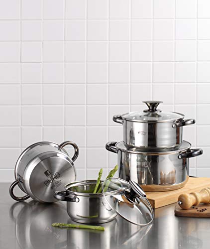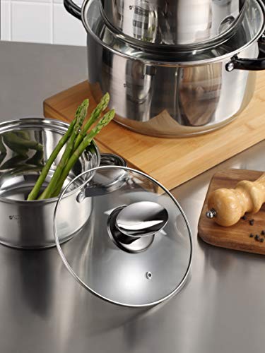- Batería de cocina de 8 piezas: 4 cacerolas con sus respectivas tapas de vidrio, fabricadas en acero inoxidable, con efectiva y rápida distribución del calor