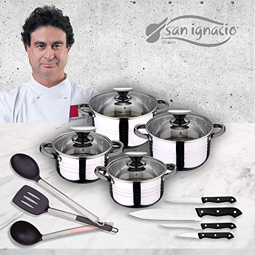 San Ignacio Premium - Bateria de 4 piezas de acero inoxidable, 4 cuchillos y 3 utensilios, acero inoxidable, 1.9L -2.7L -3.5L-5.1L