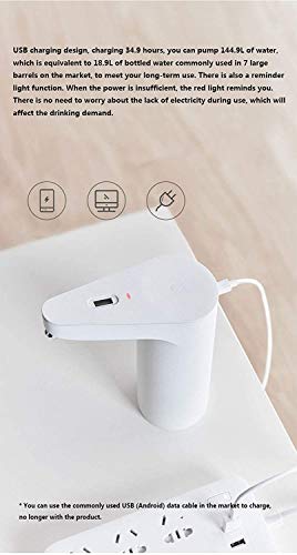 - Diseño de carga USB: Después de cargar durante 3 horas, se puede bombear 144.9L de agua, lo que equivale a 18.9L embotella agua utilizada comúnmente en 7 grandes barriles en el mercado, lo que puede cumplir con su uso a largo plazo.También hay una función de luz de recordatorio.