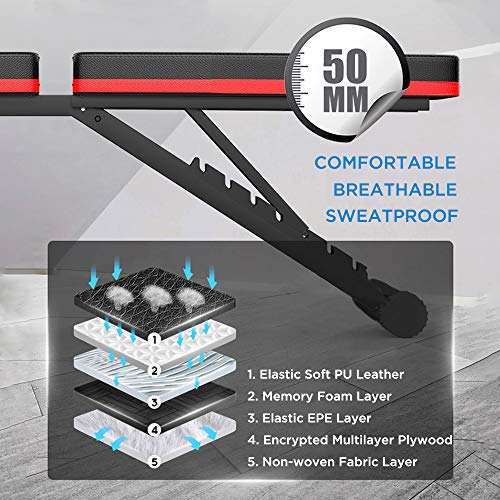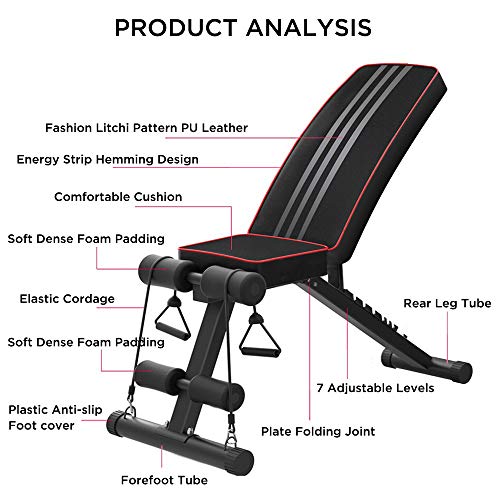 - 【DISEÑO TOTALMENTE AJUSTABLE Y PLEGABLE】 Diseñado con 7 posiciones traseras para satisfacer todas sus necesidades. Se puede usar como un banco clásico plano e inclinado, así como ejercicios con mancuernas y pesas. También se puede ajustar como banco de asiento. Le ofrece una variedad de ejercicios cambiando fácilmente la ranura de la tarjeta. El banco plegable es silencioso, fácil de transportar y puede colocarlo en la esquina o debajo de la cama cuando termine de entrenar.