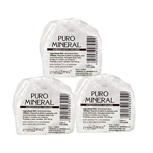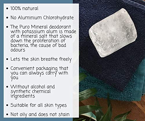 - Puro Mineral en alumbre de potasio es un desodorante 100 % natural, sin sales de aluminio ni parabenos. No está probado en animales y no mancha ni engrasa. Es apto incluso para pieles muy sensibles y está recomendado como desodorante natural para niños.