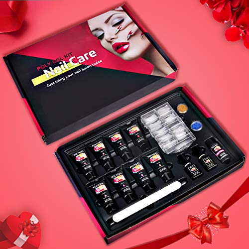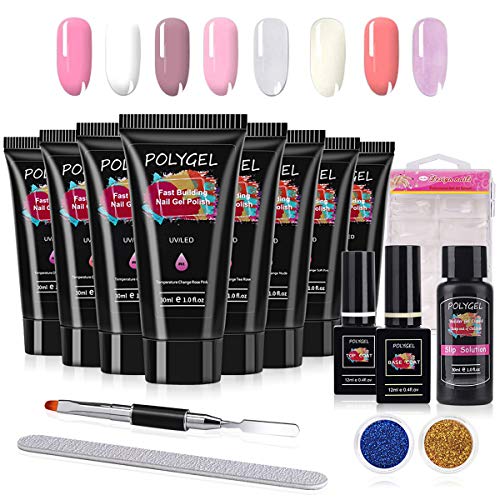 - ? [KIT DE POLY GEL TODO EN UNO] - 8 * 30ml Nail Gel, 1 * 12ml Top Coat, 1 * 12ml Base Gel, 1 * 30ml Slip Solution, 1 * Dual Head Nail Brush, 1 * Nail File, 100 piezas Moldes para puntas. Ayudarle a ahorrar dinero y tiempo en lugar de ordenar uno por uno.