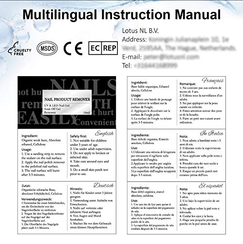 - â Uso: 1. Pulir las capas superiores( Top Coat); 2. Poner el removedor en todas las partes del Esmaltes Semipermanente; 3. Depues de unos 5 minutos los esmaltes de UV se quitan.