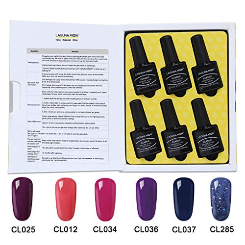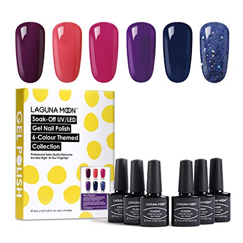 - 6pcs kit de esmaltes semipermanentes de Lagunamoon es ideal para los fan de la manicura, contiene 6 esmaltes de gel en una caja de regalo, cada uno de 8ml.