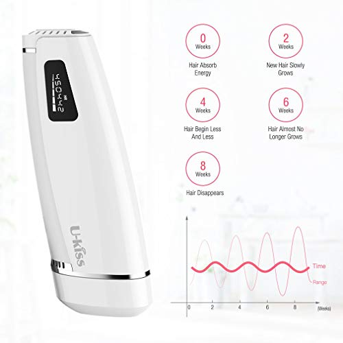 - ?【FAST & EFFECTIVE HAIR REMOVAL RESULTS】Con el dispositivo de eliminación de vello U-Kiss IPL, las mujeres suelen experimentar que el 75% de los folículos pilosos comienzan a atrofiarse y el crecimiento del vello se ralentiza y se adelgaza después de 4 semanas de tratamiento, 85% inhibe el crecimiento del cabello y se reduce visiblemente en 8 semanas, 95% del cabello Tratamiento depilado después de 12 semanas.
