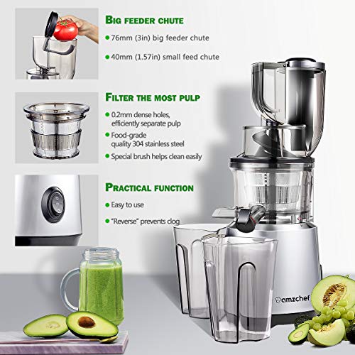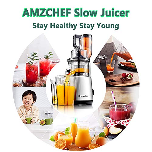 AMZCHEF Licuadora Prensado en Frio Licuadoras para Verduras y Frutas Extractor de Zumo 80mm Boca Ancha Extractor de Jugo Motor Silencioso Función Inversa Taza de Jugo Cepillo Sin BPA