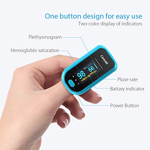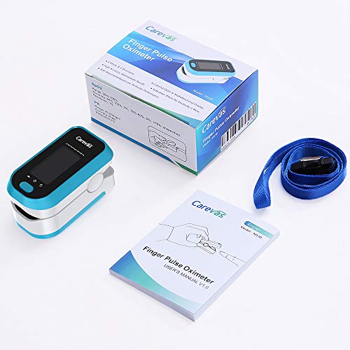 Carevas Oxímetro de Pulso, Oximetro Portátil con Pantalla OLED SpO2, Pulsioxímetro de Dedo con 6 Ángulos de Visión, Lector de Pulso Digital de Lectura Instantánea, Cordón de Nylon