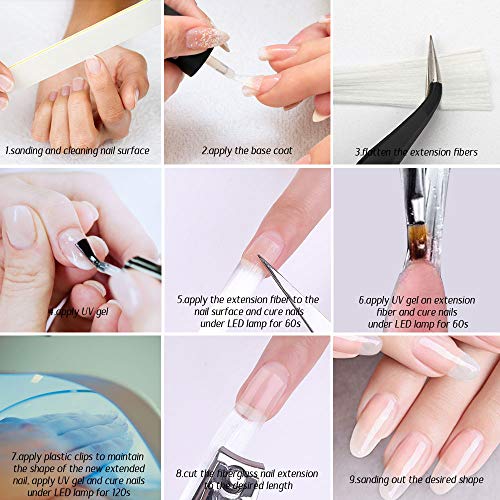 - ăFĂĄcil de usarăNo se necesita pegamento de extensiĂłn,simplemente aplique el gel base / acrĂlico / gel UV en la parte frontal y posterior de la fibra, usando clips de construcciĂłn de uñas para darle forma, luego arregle la forma con una lĂĄmpara UV / LED. Si la superficie no es lo suficientemente plana, aplique una capa mĂĄs de gel y curarlo de nuevo.