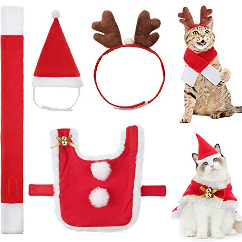 4 Piezas Trajes de Disfraz de Navidad de Mascotas Ropa de Gato Ajustable Sombrero de Navidad de Santa de Disfraz de Gato y Bufanda Sombrero de Asta de Reno para Disfraz Fiesta Navidad