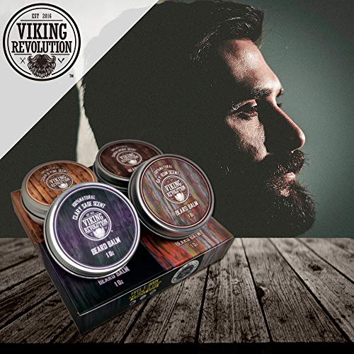Viking Revolution Bálsamo para Barba Paquete de 4 (1 oz cada uno) - Sándalo, Pino y Cedro, Bay Rum, Salvia-, Fortalece y suaviza barba y bigote - Acondicionador sin enjuague, Cera para barba y bigote