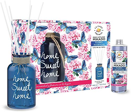 - La colección de ambientadores Mikados “Home Sweet Home” han sido creados con un diseño exclusivo, perfectos para regalar. Contiene una botella de vidrio ideal para decorar espacios. El aroma a Flores Acuáticas desprende notas frescas y florares del lirio de los valles.