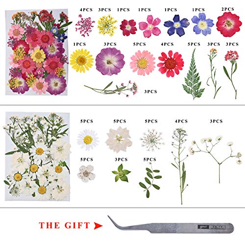 - ?Surtido de flores y hojas prensadas secas: Recibirás 2 paquetes de flores y hojas secas en un empaque al vacío independiente, cada paquete contiene diferentes tipos de flores y hojas, para un total de 75 piezas, que incluyen campanula, rosa, crisantemo, artemisia, margarita, lirio de los valles, etc Te regalamos unas pinzas para el bricolaje.