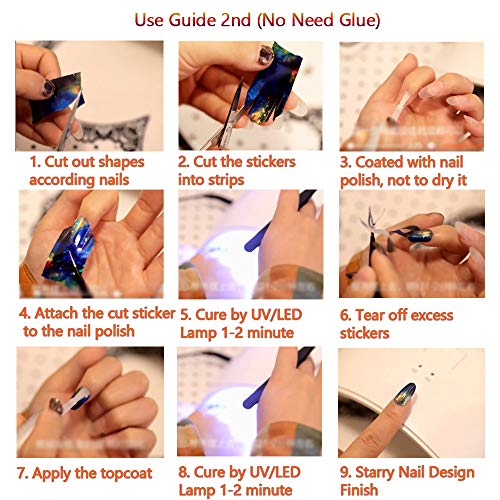 - FÔcil de usar: presione la lÔmina sobre las uñas después de aplicar el esmalte de color durante unos segundos, y obtendrÔ el bonito diseño de arte de uñas, estas pegatinas de lÔmina de uñas se pueden usar en esmaltes regulares y esmaltes de gel UV, ideales para uso en el salón o en el hogar.