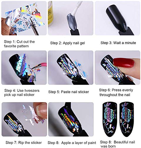 - FƔcil de aplicar: presione la lƔmina sobre las uƱas despuƩs de aplicar esmalte de color, solo unos segundos, puede obtener el diseƱo fino del arte de uƱas. Se puede usar para esmalte regular y esmalte de gel UV. el principiante tambiƩn puede obtener un diseƱo de uƱas perfecto en minutos.