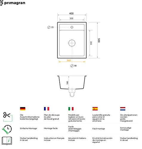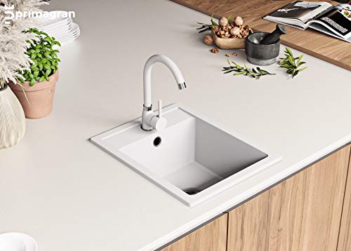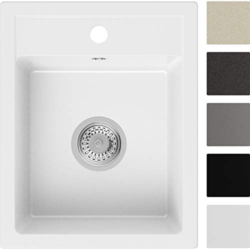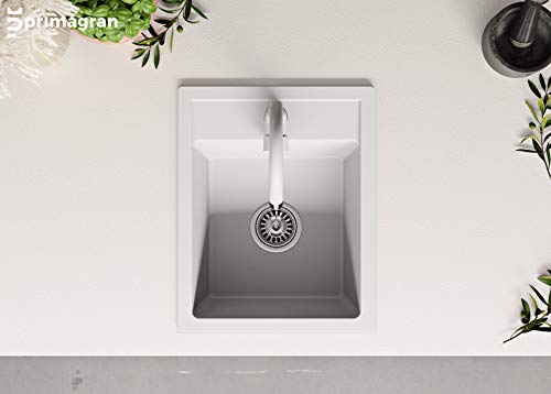 Fregadero de Granito con Sifón Riga Fregadero Empotrado Bianco Armario Cocina 40cm Lavabo de Granito con Sifón y Rejilla Primagran