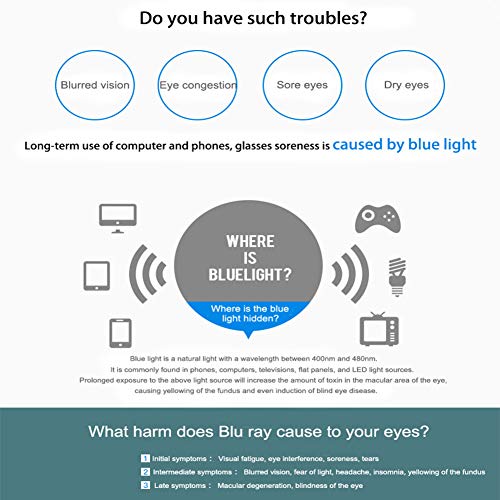 - ➤REDUCCION DE LA FATIGA OCULAR: La exposición excesiva a la luz azul es una de las principales causas de fatiga ocular, pérdida de visión o dolor de cabeza. Como una de las marcas más avanzadas de la industria de la tecnología de la información, le ofrecemos gafas para ordenador antifatiga para aliviar la fatiga ocular y mantener los ojos sanos.