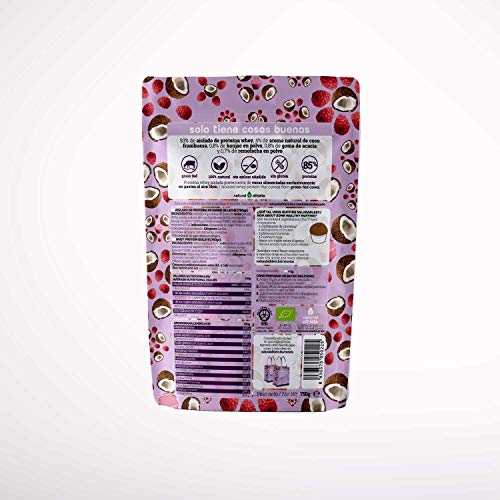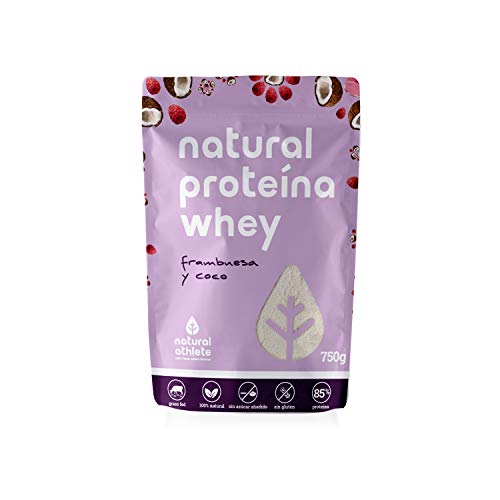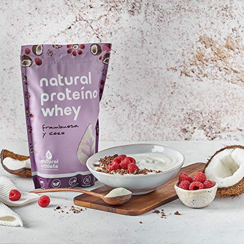 Proteína Whey Frambuesa/Coco Natural Athlete Aislado de Suero de Leche de Vacas de Pastoreo Sin Azúcar Añadido, 100% Natural, Sin Gluten – 750 g