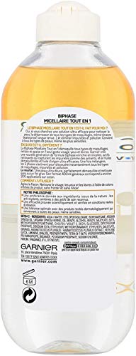 - Contenido: 1 solución micelar biphase todo en un Garnier SkinActive, Maxi-formato: 400 ml.