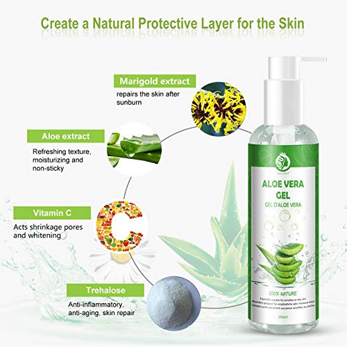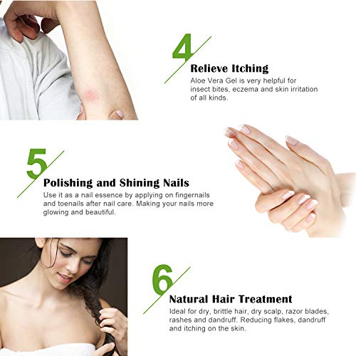 - ❤Efecto significativo: el gel de aloe vera ayuda a curar las quemaduras solares, alivia las dolencias de la piel causadas por quemaduras leves o quemaduras solares, refresca e hidrata la piel y también mejora la lesión. Ayuda a curar heridas, alivia las erupciones, reduce la picazón y la caspa El cuero cabelludo, ayuda contra la celulitis persistente, calma la piel después del afeitado y mucho más.