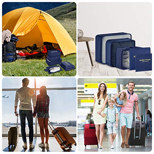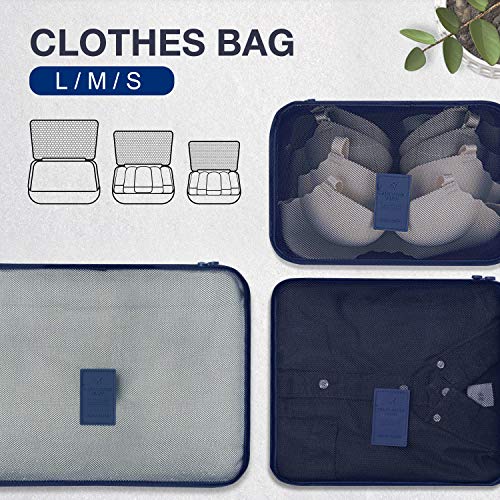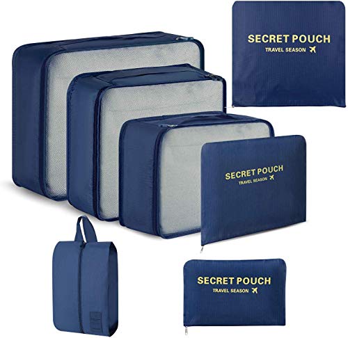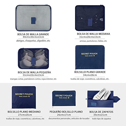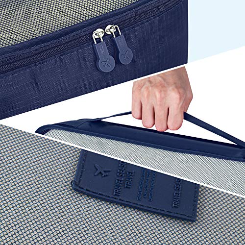 Newdora 7 en 1 Set de Organizador de Equipaje Viaje con Bolsa de Zapato,Impermeable Organizador de Maleta Bolsa para Ropa Sucia de Viaje, Portatrajes de Viaje, Material Nylon, Azul Oscuro