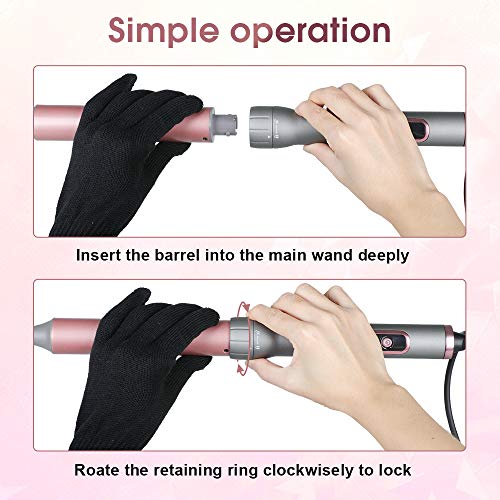 - ?CONVENIENTE & SEGURO?:Los 6 barriles intercambiables que tiene la función de bloqueo.Presione el botón en el mango para reemplazar el barrile rápido y luego lo bloquee,que no tiene que preocuparse de que el barrile cae mientras lo usa.Con un diseño punta de antiescaldadura y guantes resistentes,crea distintos rizos fácilmente mientras protecta a su mano.