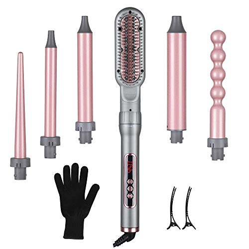Rizador de Pelo 6 en 1,con Cepillo Alisador de Pelo,Planchas Rizadoras Multifunción con Pantalla LCD,Temperatura Ajustable,Barras Recambiable,100% Cerámicas de Turmalinas no Dañar el Pelo,con Guante