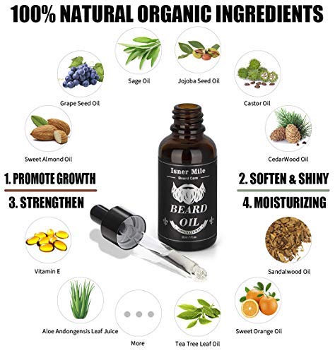 - INGREDIENTES NATURALES Y ORGÁNICOS: una barba sana equivale a un hombre feliz. Estamos comprometidos a buscar material de alta calidad. Nuestro aceite de barba contiene múltiples ingredientes como aceite de semilla de jojoba, aceite de semilla de uva, aceite de almendras dulces, aceite de semilla de ricino, aceite de hoja de árbol de té, tocoferol, etc, dejando la barba lejos de aditivos químicos.