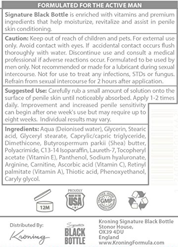 - FORMULACION DE PRIMERA CALIDAD: La crema hidratante peneana Signature Black Bottle presenta una mezcla única de ingredientes de primera calidad. La L-arginina, la Manteca de Karité, los Aminoácidos y las Vitaminas, ayudan a hidratar profundamente la piel en el área peneal.
