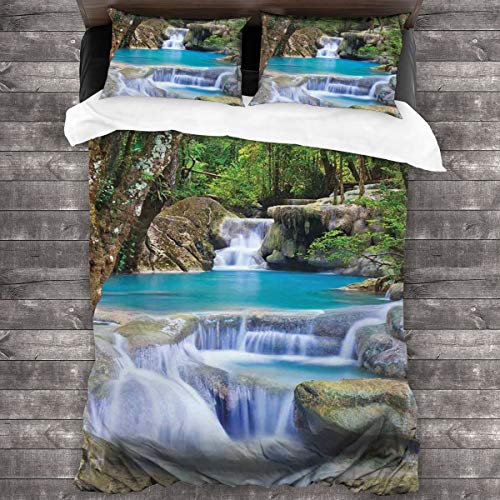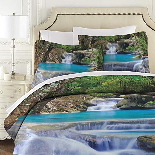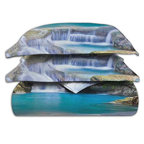 NOLYXICI Cascada Imagen de Hadas de la Cascada asiática Junto a Las Rocas en el Bosque Paraíso Secreto Decorativo Verde Azul Borwn Fundas Edredon 140x200cm con 2 Fundas De Almohada