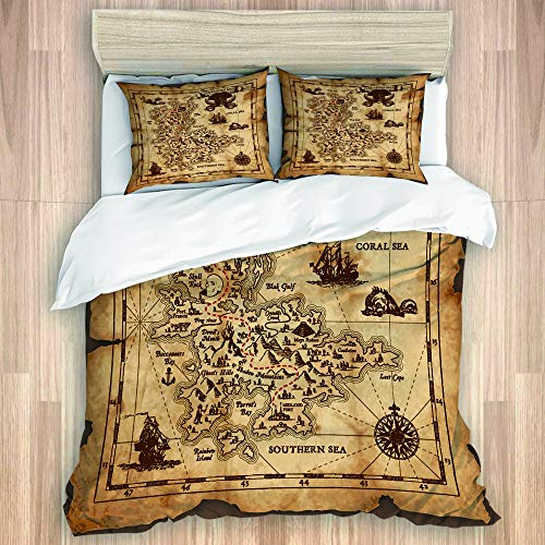 TARTINY Súper detallado Mapa del Tesoro Grungy Rustic Pirates Gold Secret Sea History Theme,Juego de Ropa de Cama con Funda nórdica de Microfibra y 2 Funda de Almohada - 140 x 200 cm