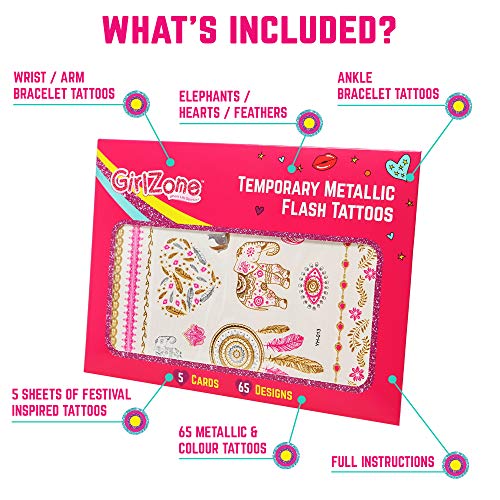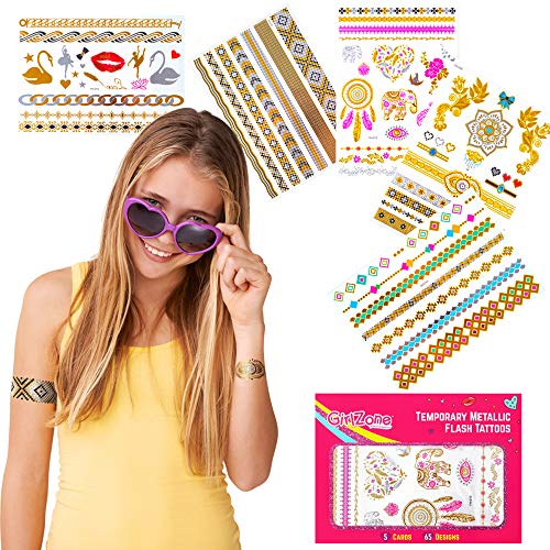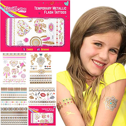GirlZone Regalos para Niñas - Tattoos Infantiles Tatuajes Niñas - Pack de 65 Tatuajes Temporales para Niñas - Dorados, Metálicos Y Brillantes - Flash Tattoos 4 - 12 Años Halloween