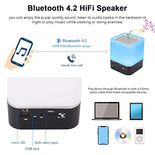 - ♫ 【Multifunción 5 en 1】 Luz de noche táctil, altavoz Bluetooth 4.2 HiFi, reloj despertador digital, reproductor de MP3, llamadas manos libres, radio FM. El altavoz Bluetooth compatible con todos los dispositivos Bluetooth, admite tarjeta TF, tarjeta SD, entrada de video AUX, función de llamada. Todo lo que necesitas está todo en la cajita