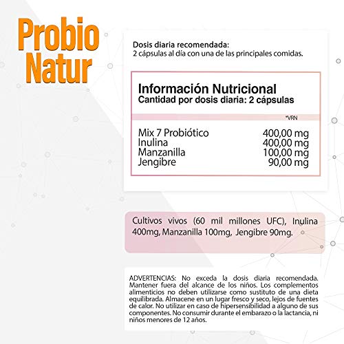 - POTENTE PROBIÓTICO - ProbioNatur posee una exclusiva fórmula de 20 cepas probióticas vivas que aportan 60 mil millones UFC, además de Prebióticos Puros, Manzanilla y Jengibre para reforzar su acción.