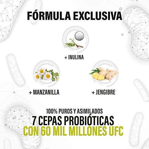 20 Cepas Probióticas Únicas con 60 mil millones UFC + Inulina + Manzanilla + Jengibre | Protege y Mejora la Flora Intestinal | Aumenta tus Defensas | Optimiza tu Organismo | 90 cápsulas naturales.