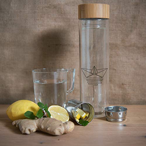 - DETALLES: RecibirĂĄs 1x botella de cristal con una capacidad de 500 ML y unas dimensiones de 7 x 25.5 CM. El filtro es de acero inoxidable, la tapa de bambĂș y la funda de neopreno.