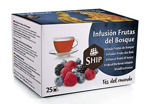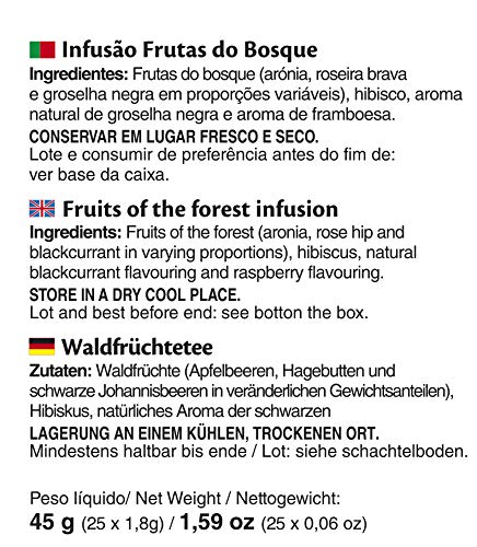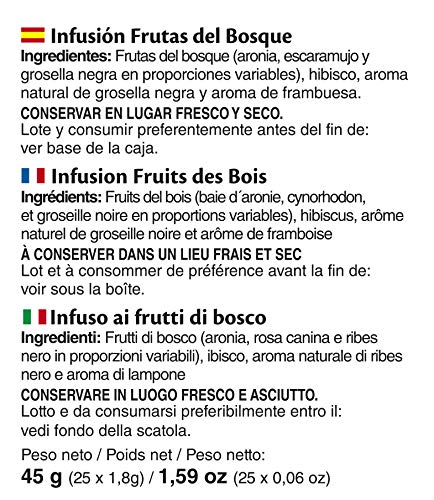 - Ingredientes: frutas del bosque: manzana, bayas de sauco, escaramujo, aroma de frambuesa, moras y fresas en porciones variables; hibisco y aromas